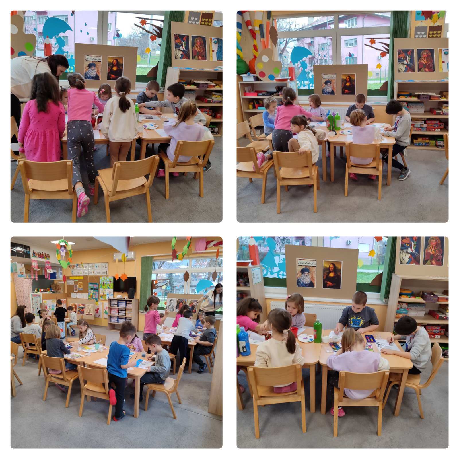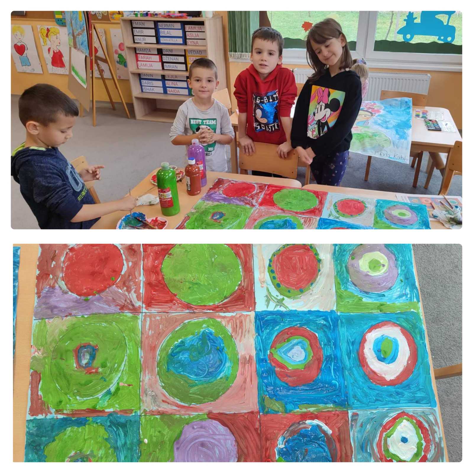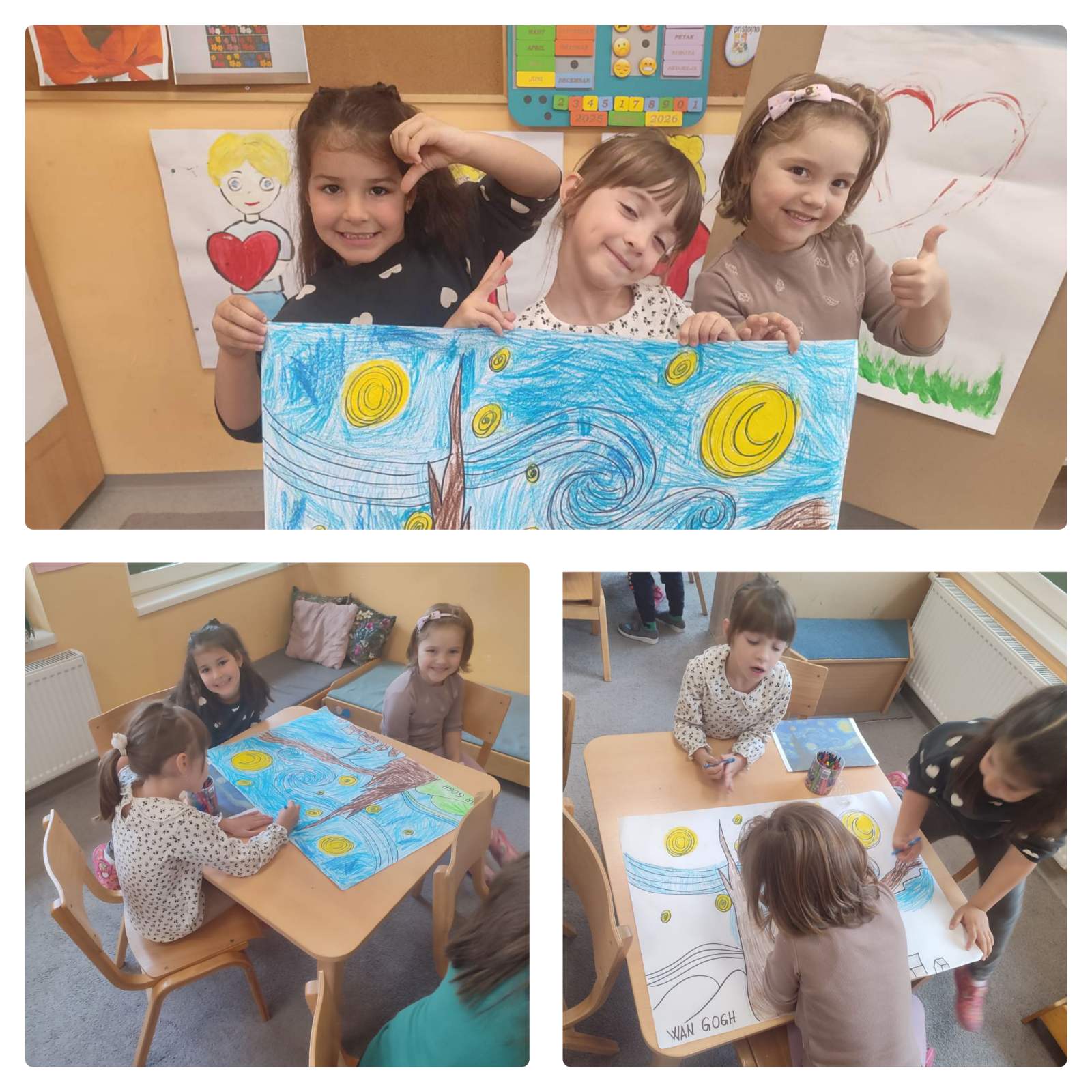 🖌️ Aktivnosti je prethodilo upoznavanje djece s likovnim tehnikama i materijalima kroz djela velikih slikara, čime su razvijali divergentno mišljenje, maštovitost, slobodan likovni izraz i estetski doživljaj. Djecu su posebno oduševila djela Vincenta van Gogha, poput Zvjezdana noć i Suncokreti, te radovi Fride Kahlo. Kroz djela Vasilija Kandinskog mališani su, osim likovne umjetnosti, istraživali geometrijske oblike poput kruga i kvadra, što je dodatno obogatilo njihovo iskustvo.