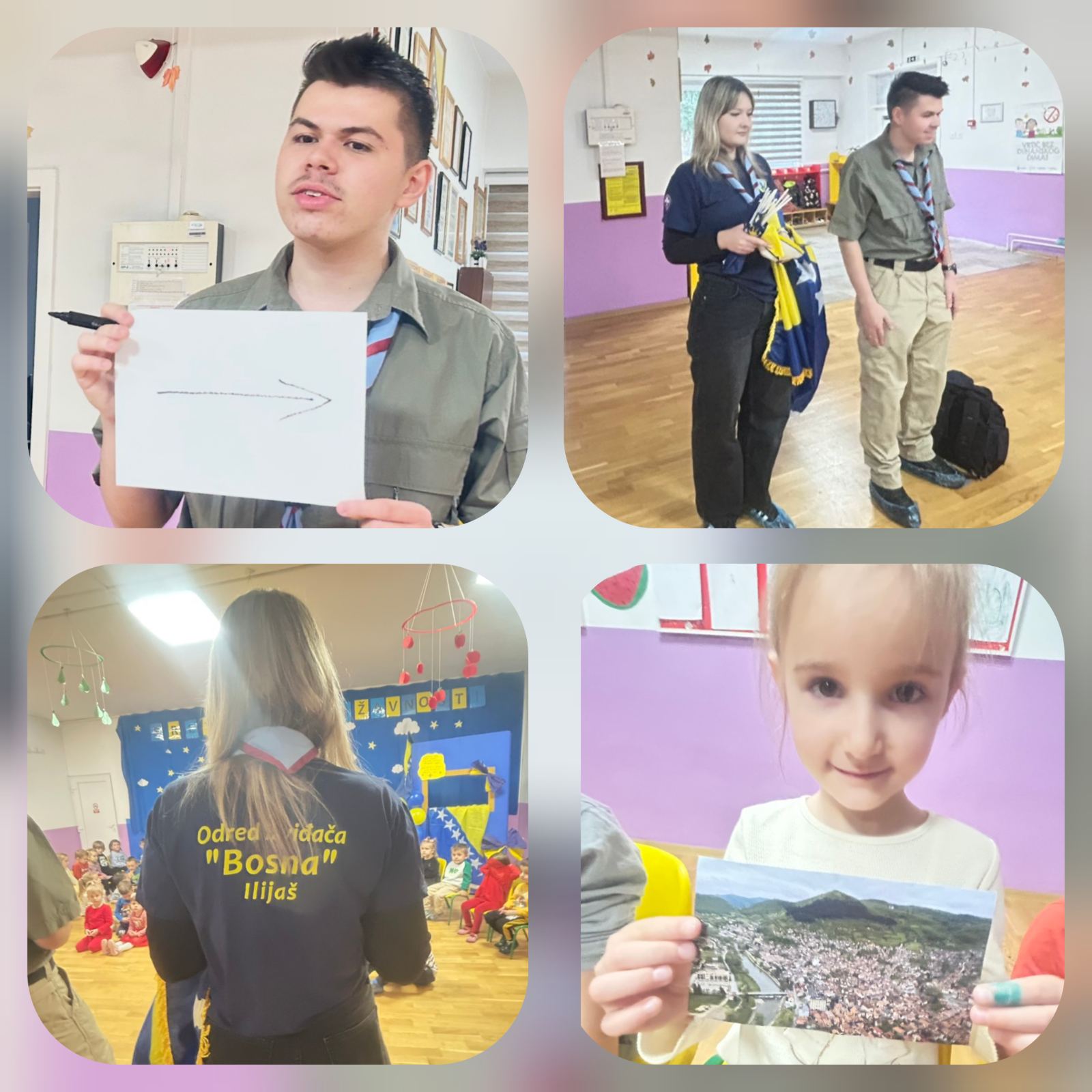 Ponovo u vrtiću nakon 13 godina, izviđači su djeci približili pojam izviđača, pokazali kompas, razgovarali o domovini, te sa grupama realizovali poligon „Prođoh Bosnom kroz gradove“.