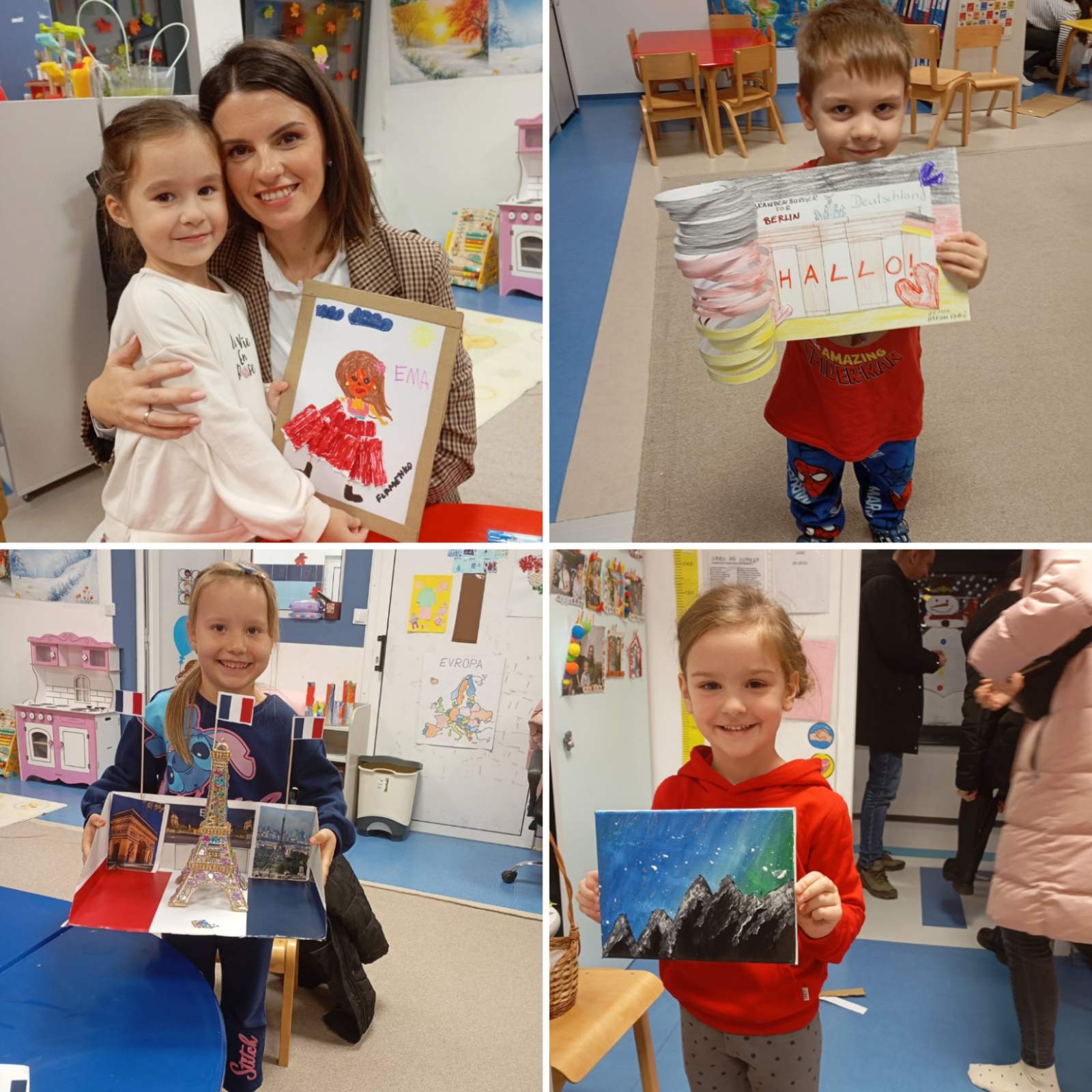 Svako dijete, zajedno sa svojim roditeljem, izabralo je zemlju koja im je na poseban način bliska. Kroz kreativne uratke i male radionice, djeca i roditelji su zajedno dočarali ljepotu tih zemalja – kroz boje, oblike, igru i maštu. 🖌️🎨