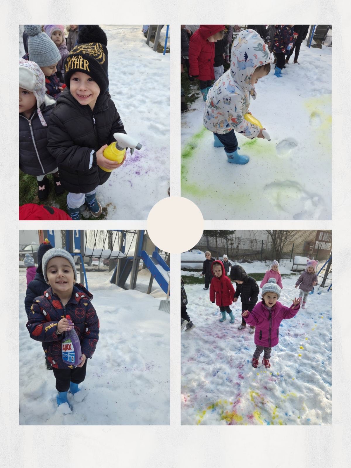 🎨 Dana, 14. januara 2026. godine djeca iz odgojne grupe u četvrtoj godini života realizovala su zimsku aktivnost bojenja snijega u dvorištu vrtića. Uz podršku roditelja, koji su obezbijedili potrebne rekvizite, djeca su obojila dio dvorišta zimskim i razigranim bojama, čineći snježni prostor zanimljivim, poticajnim i inspirativnim za igru i istraživanje.
