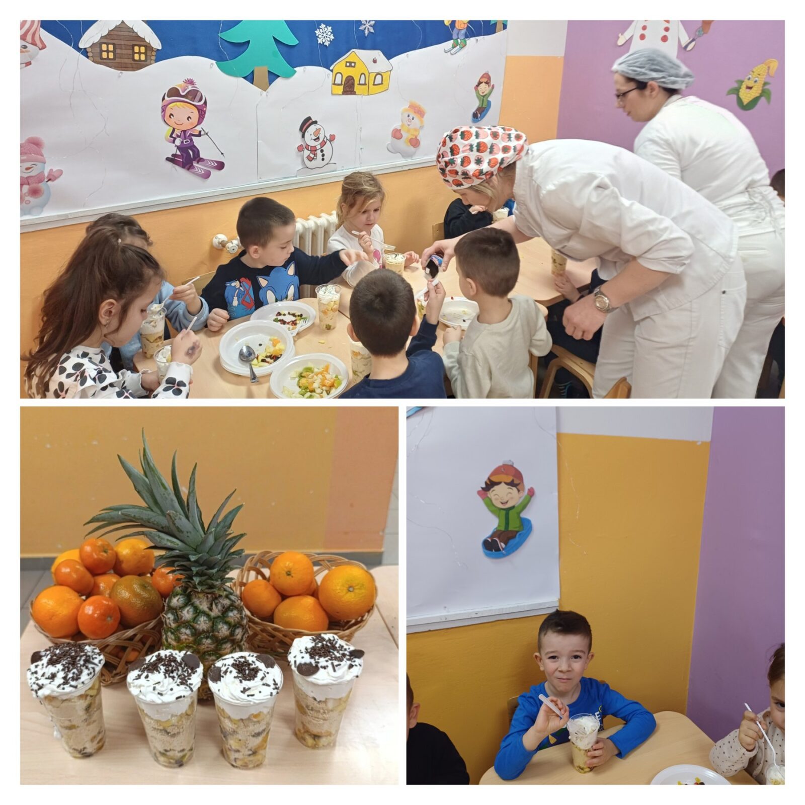 🍌Zajedno s gošćom, djeca su učestvovala u pripremi voćnog kupa, birajući, režući i kombinujući različite vrste voća. Kroz praktičan rad, mališani su razvijali zdrave navike prema zdravoj ishrani i s velikim zadovoljstvom degustirali vlastite kreacije.