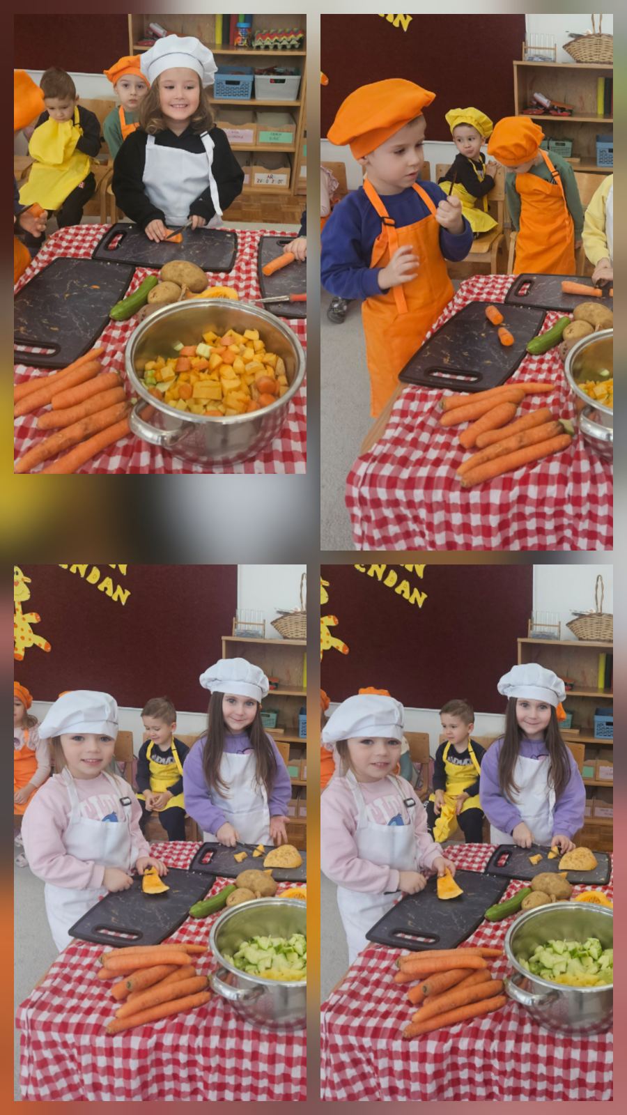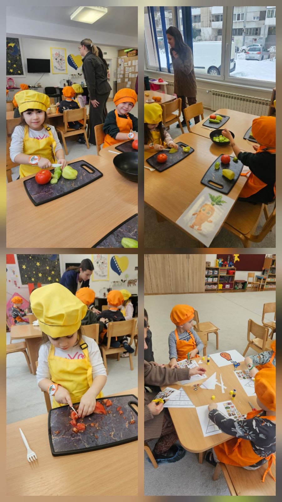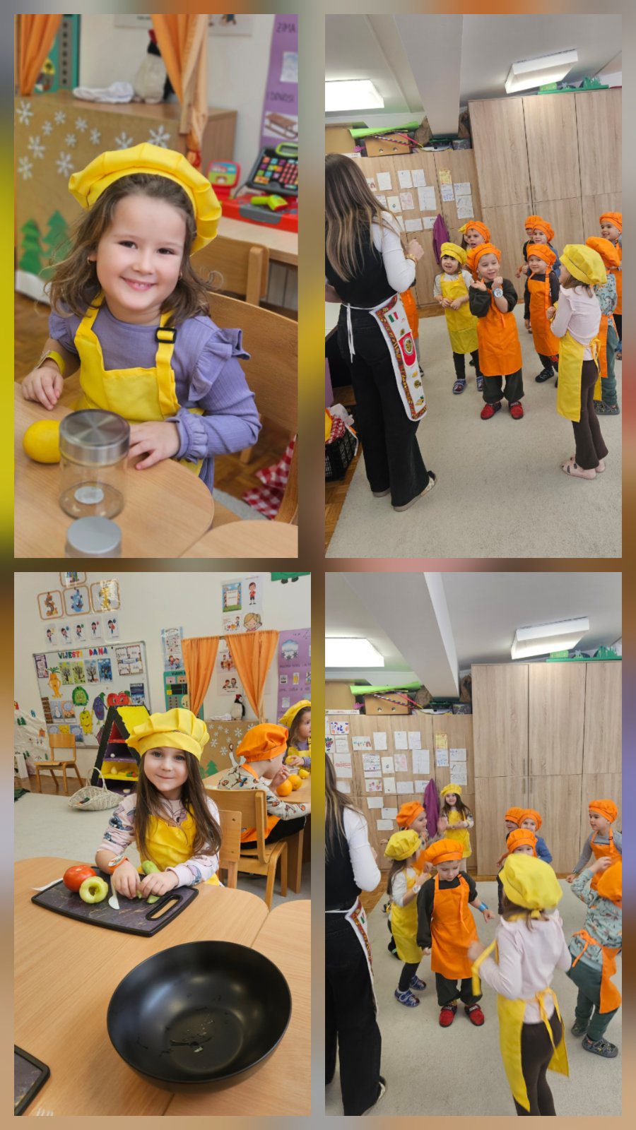 👧🏼👦🏻 Kroz praktične i iskustvene aktivnosti djeca su učestvovala u pripremi salate od povrća, čorbice od povrća, zdravih kolača, kao i soka od limuna i narandže. Na taj način razvijala su zdrave prehrambene navike, samostalnost, saradnju i odgovoran odnos prema hrani.