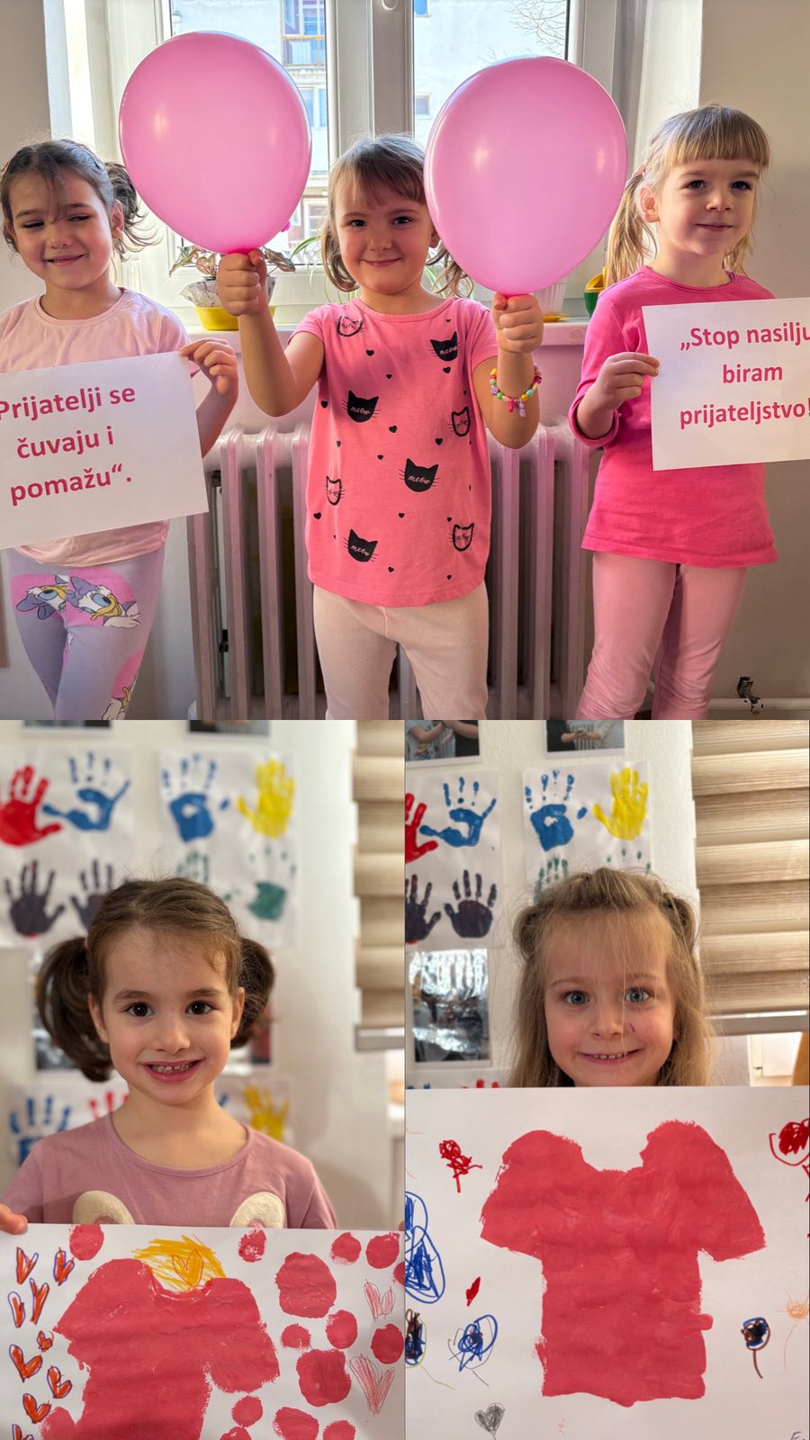 💗 U vrtiću “Slavuj”, u odgojnoj grupi djece u 6. godini života, obilježen je 👚Dan ružičastih majica. Djeca su kroz kreativne aktivnosti i razgovore učila o važnosti prijateljstva, poštovanja i podrške vršnjacima, šaljući jasnu poruku protiv vršnjačkog nasilja.