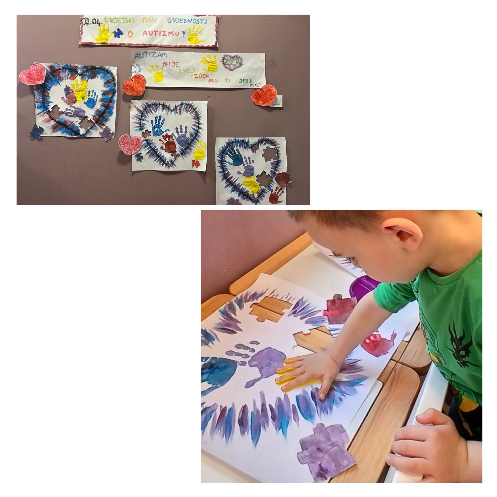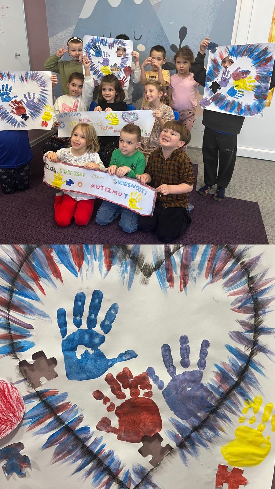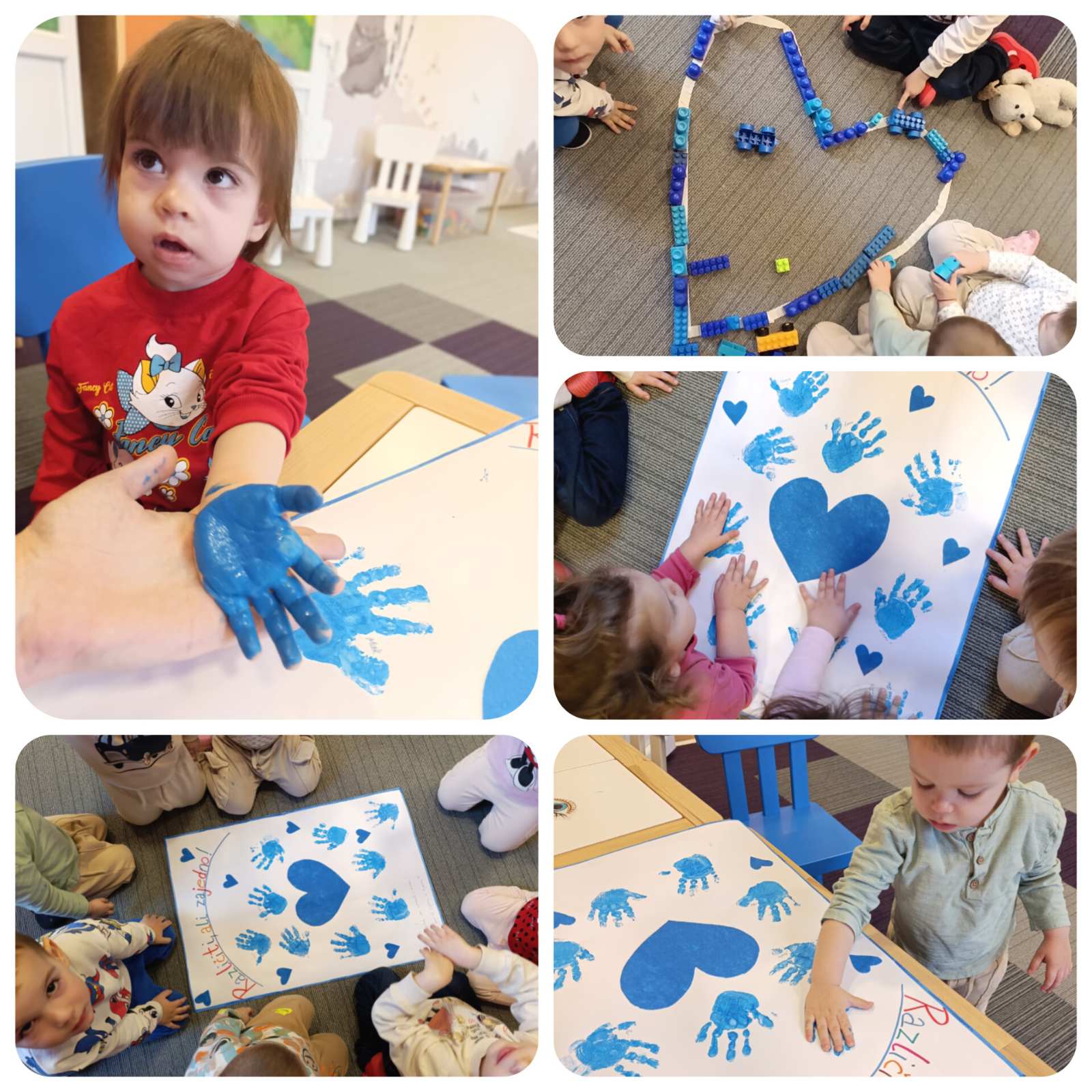 💙 U radu s djecom iz dvije mješovite odgojne grupe (od 6 mjeseci do 3 godine i od 3 godine do polaska u školu), kroz igru, pokret i kreativne aktivnosti, mališani su na svoj način učili da smo svi različiti – i baš takvi posebni. Kroz zajednički rad nastao je plakat s otiscima malih ruku koji nosi veliku poruku prihvatanja, prijateljstva i zajedništva.