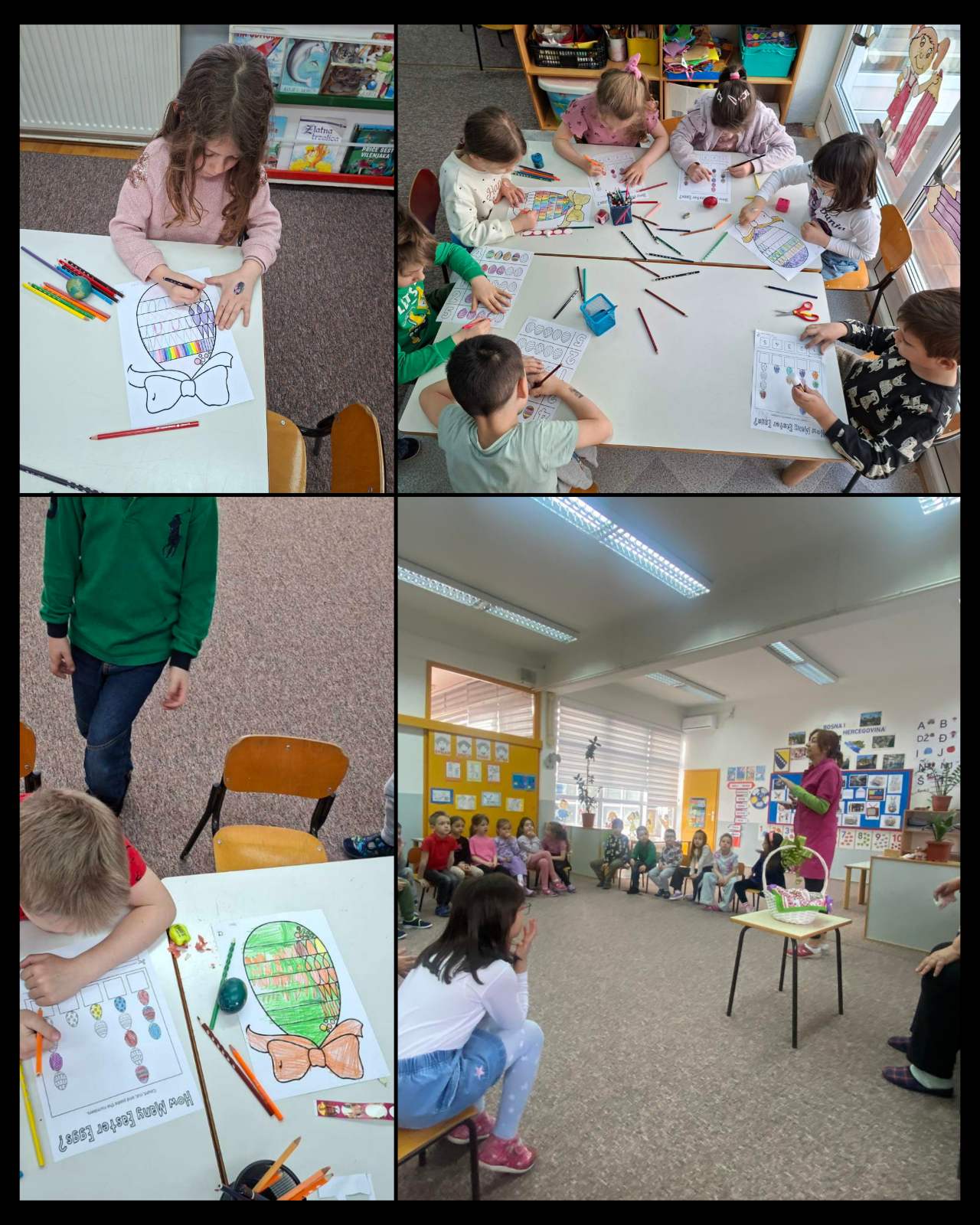 🎨 Djeca su s velikim interesovanjem slušala baku Jagodu i aktivno učestvovala u razgovoru, postavljajući pitanja i dijeleći svoja iskustva. U nastavku su sa oduševljenjem ukrašavala jaja naljepnicama i bojila bojanke sa motivima jaja. Aktivnost je protekla u vedroj, kreativnoj i prazničnoj atmosferi ispunjenoj smijehom i radošću.