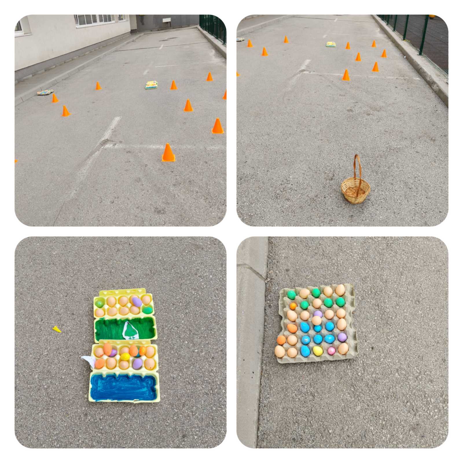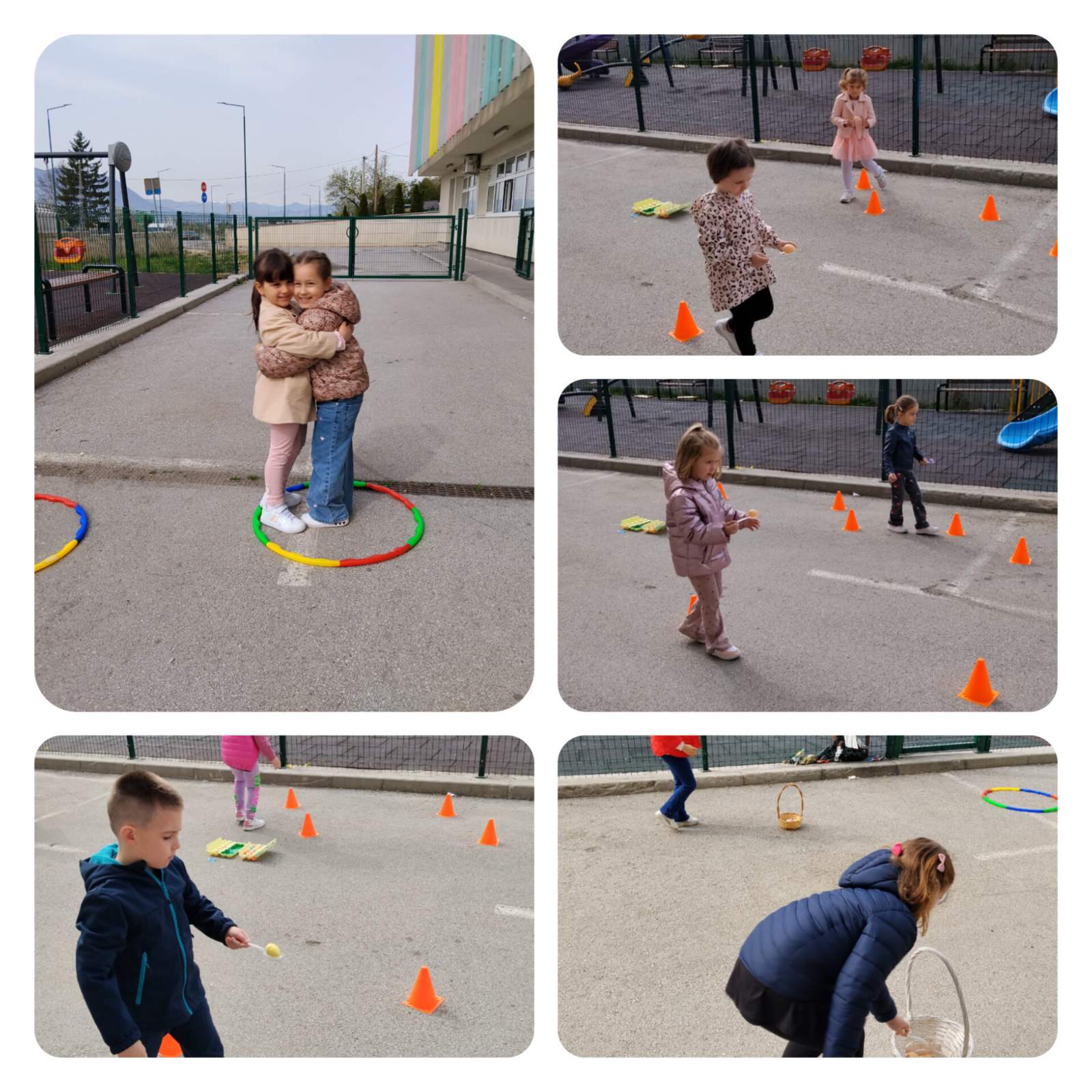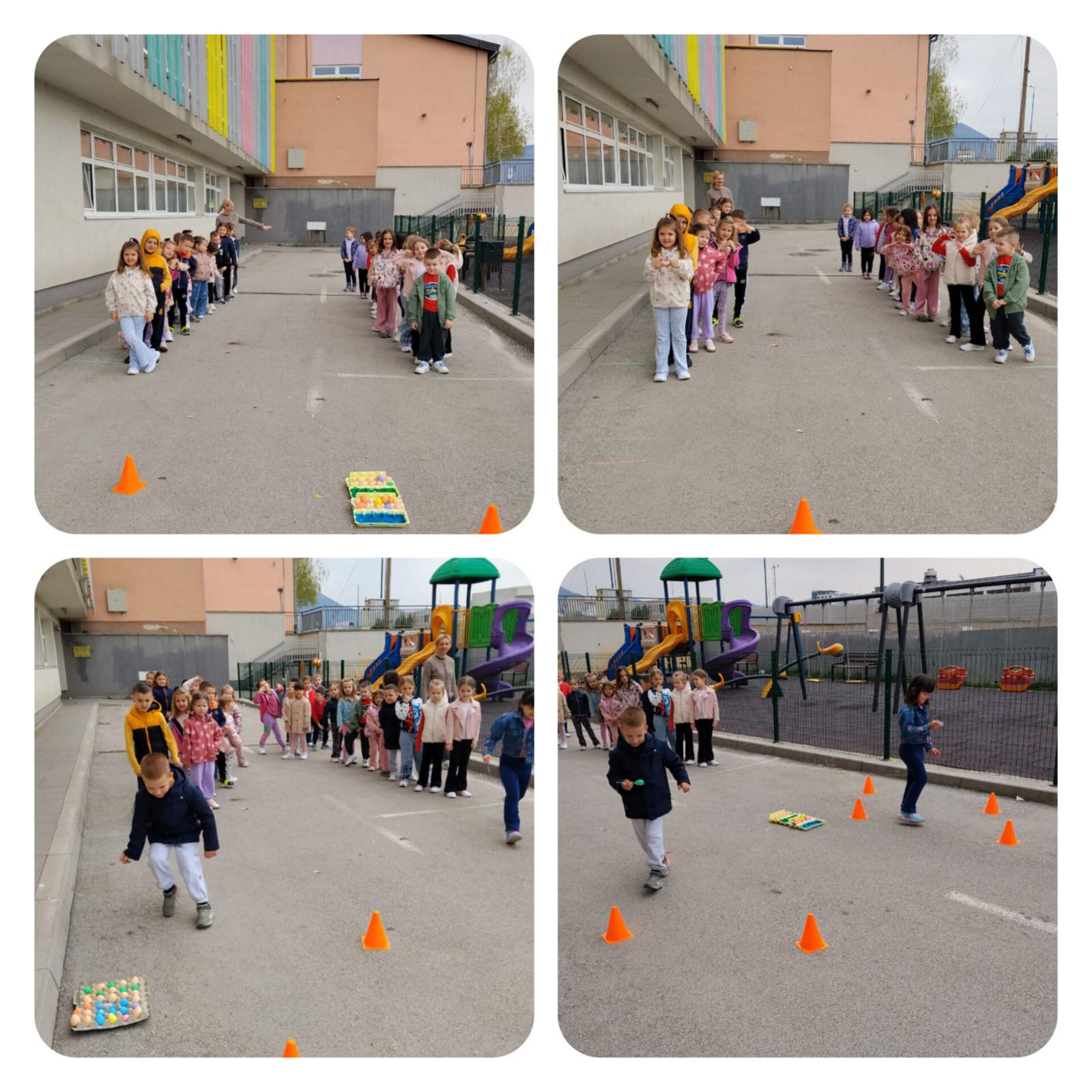 🐣 Kroz poligon prepreka djeca su razvijala koordinaciju i ravnotežu, a posebno su uživala u zadatku nošenja šarenih jaja u kašici, čime su dodatno vježbala koordinaciju oko–ruka. Jaja su pažljivo prenosila i odlagala u košarice, a aktivnost su završila najljepšim poklonom – zagrljajem drugarstva.