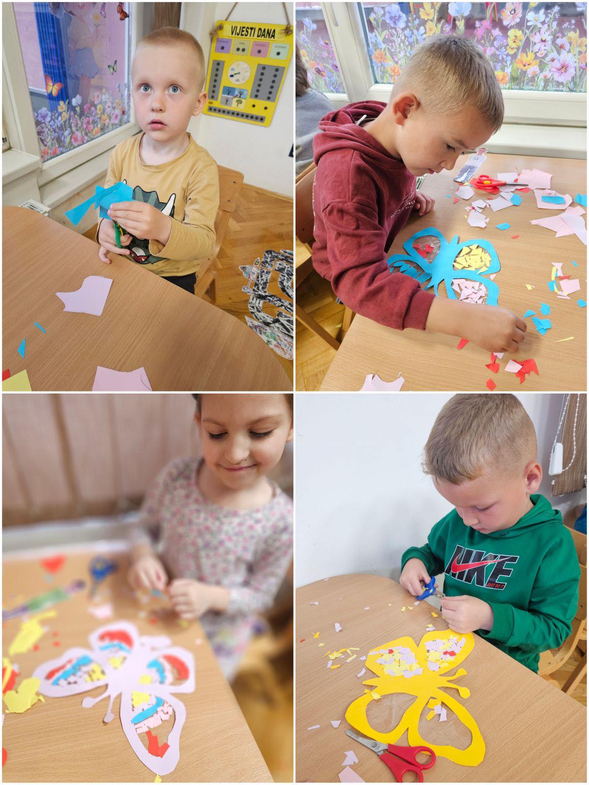 🎨 Kreativni segment obuhvatio je izradu i ukrašavanje leptira. Djeca su koristila oblike prilagođene njihovim siluetama, što je dodatno osnažilo osjećaj ličnog izraza i povezanosti s vlastitim radom. Kroz ovu aktivnost razvijali su maštu, estetski doživljaj i kreativno izražavanje.