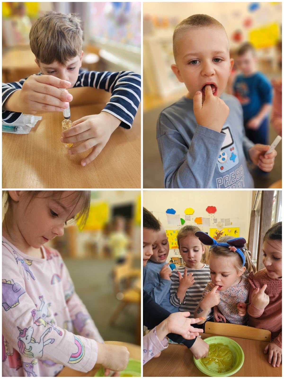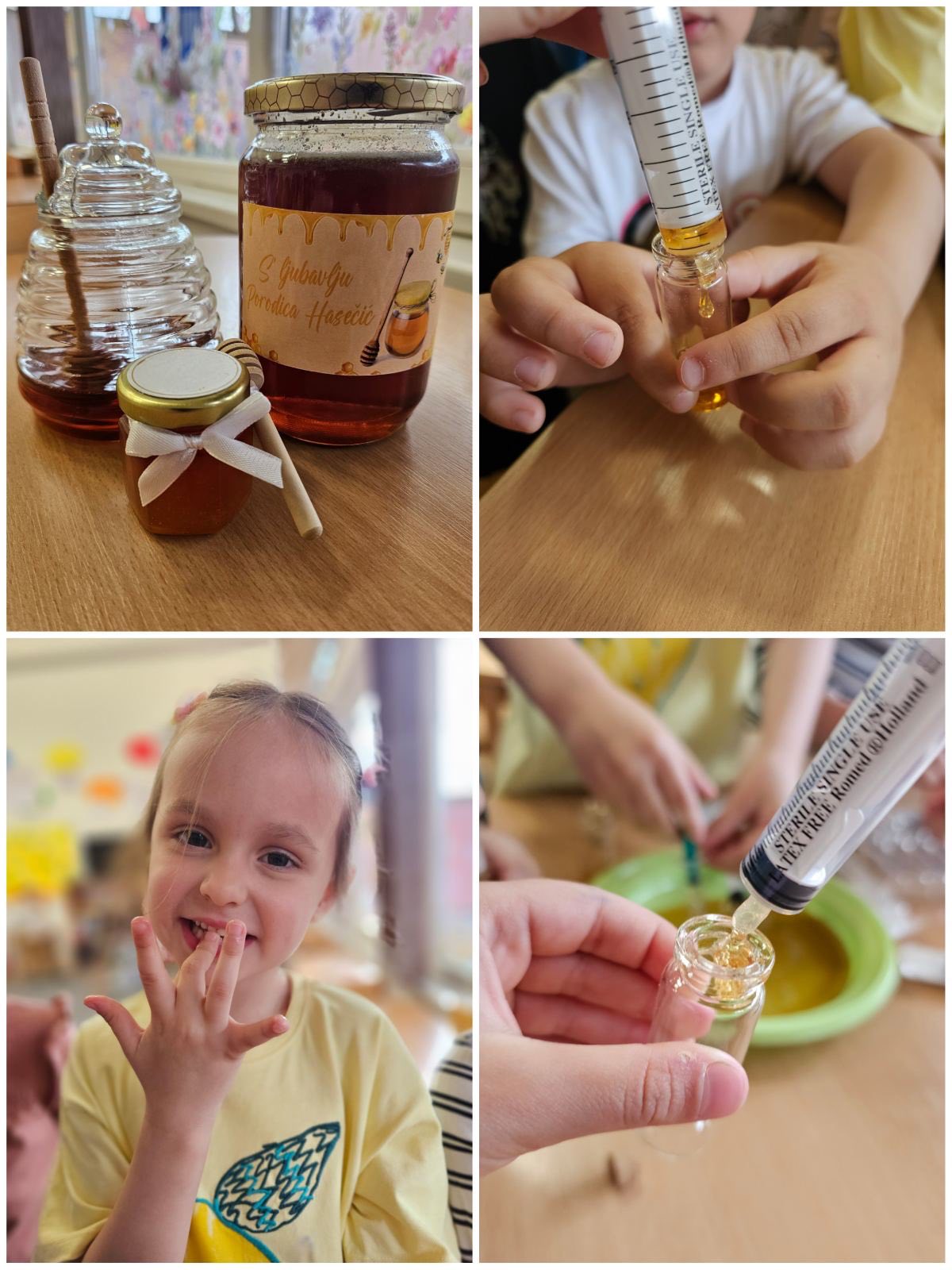 🧪 U praktičnom dijelu aktivnosti djeca su pomoću kapaljki prebacivala med u različite posude, razvijajući finu motoriku, koordinaciju oko–ruka, preciznost pokreta i strpljenje. Ove aktivnosti podsticale su senzornu percepciju, istraživački duh i razumijevanje jednostavnih prirodnih procesa kroz iskustveno učenje.