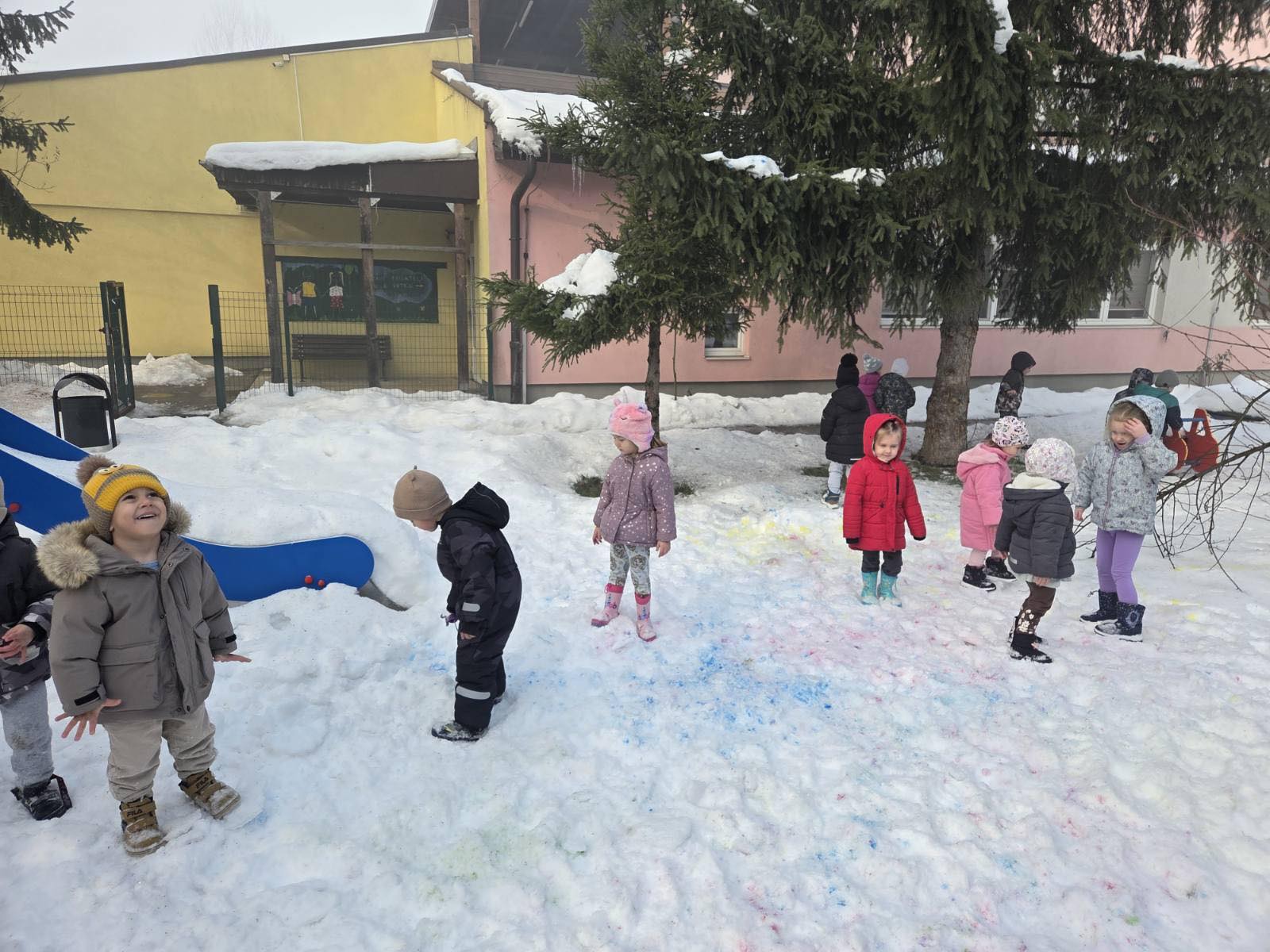 🎨 Dana, 14. januara 2026. godine djeca iz odgojne grupe u četvrtoj godini života realizovala su zimsku aktivnost bojenja snijega u dvorištu vrtića. Uz podršku